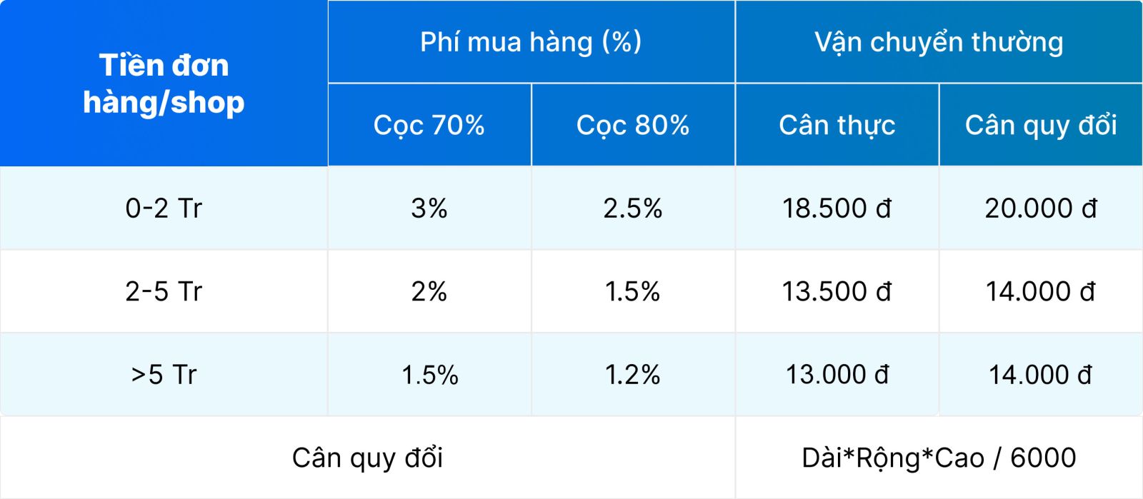 | 2. Chúng tôi thu | Phí mua hàng tính theo % và cước vận chuyển nhanh tính theo kg |